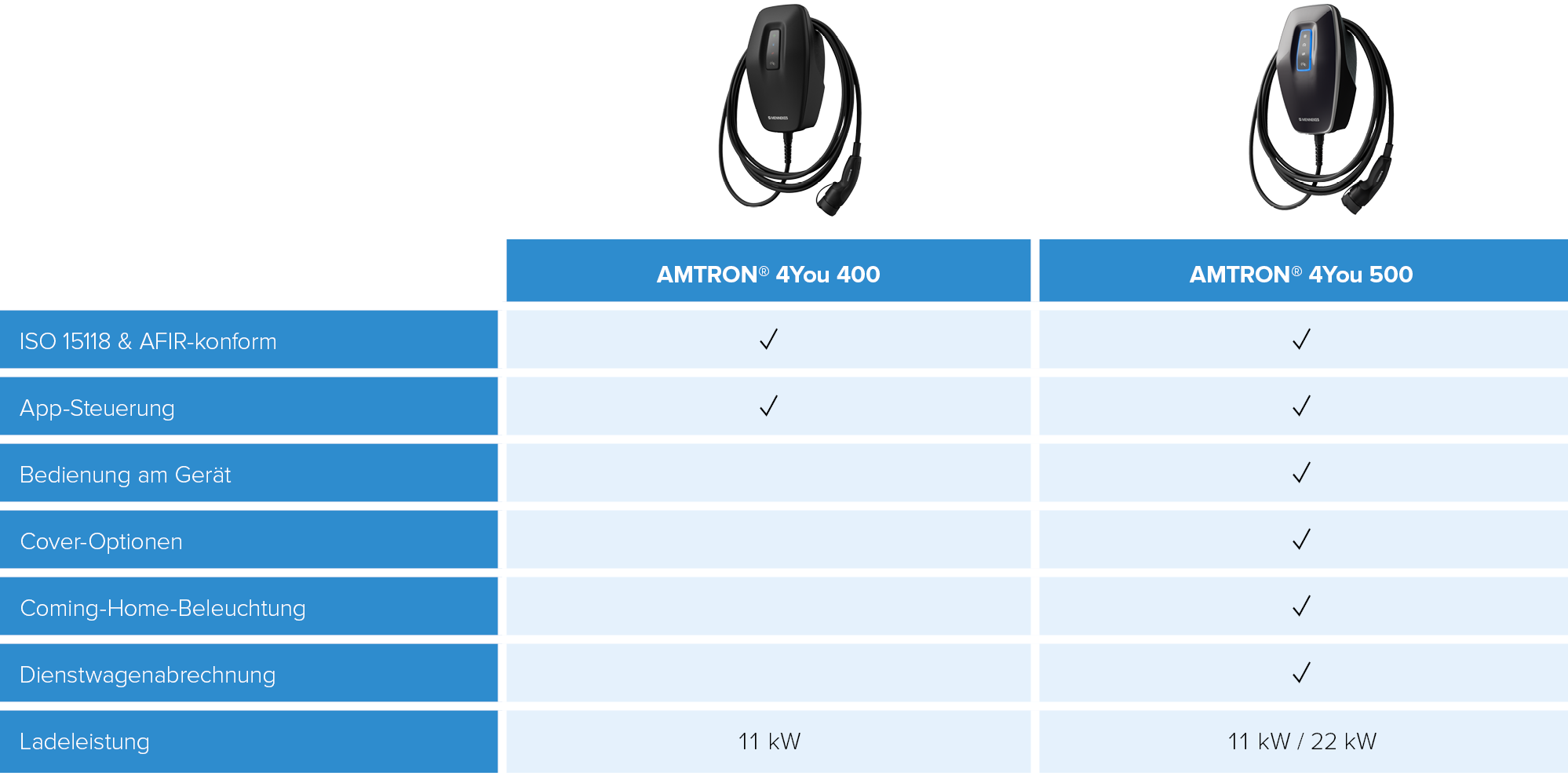 Der AMTRON® 4You 400 ist die funktionale Lösung für das Laden zu Hause, während der AMTRON® 4You 500 zusätzliche Komfort-Features bietet. Die 500er-Version ermöglicht die Bedienung direkt am Gerät, bietet individuelle Cover-Optionen, Coming-Home-Beleuchtung und die Dienstwagenabrechnung. Außerdem ist sie in Varianten mit 11 und 22 kW erhältlich. Der AMTRON® 4You 400 verzichtet bewusst auf diese Extras und konzentriert sich auf die Kernfunktionen – für alle, die eine preisbewusste und dennoch intelligente Lösung suchen.